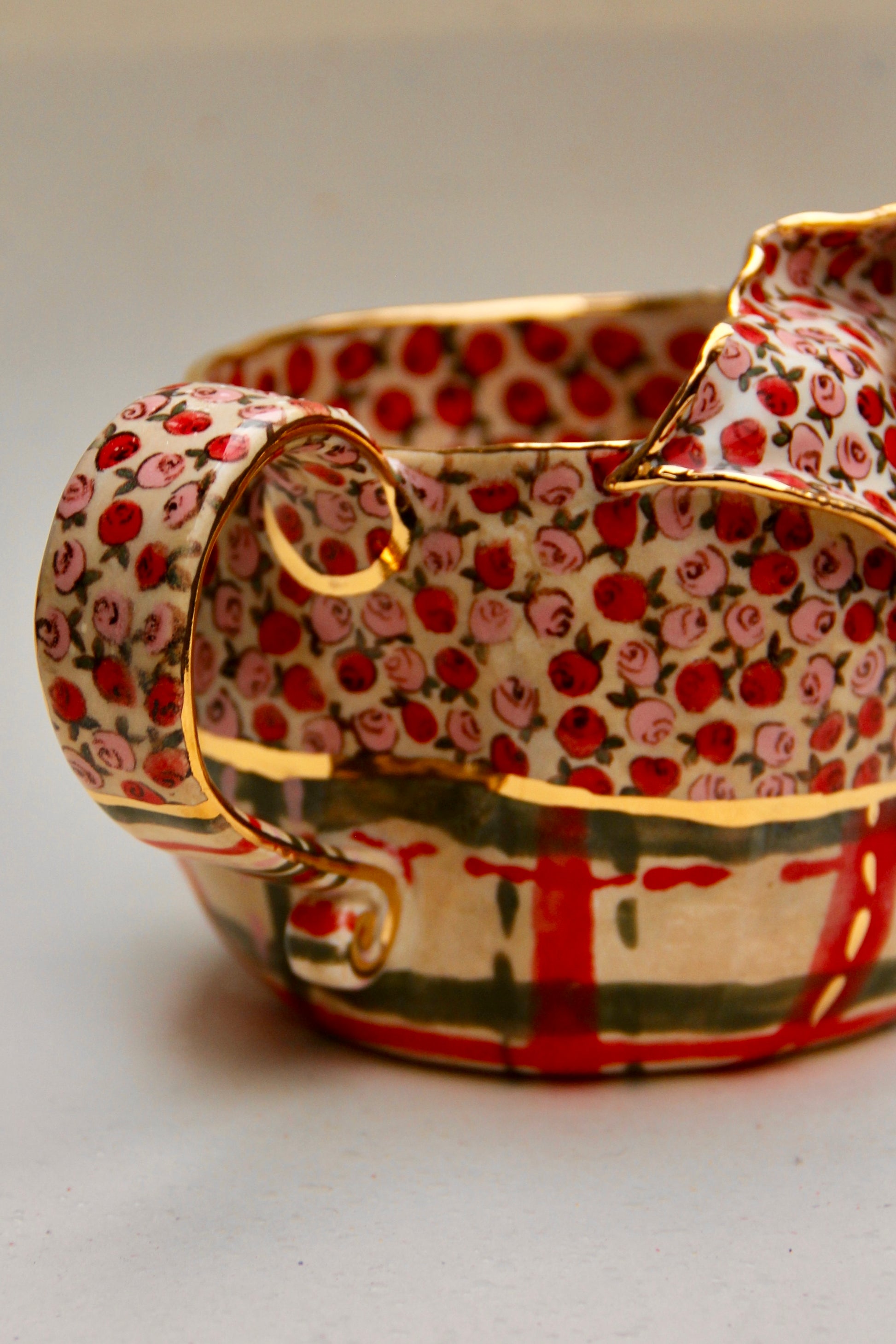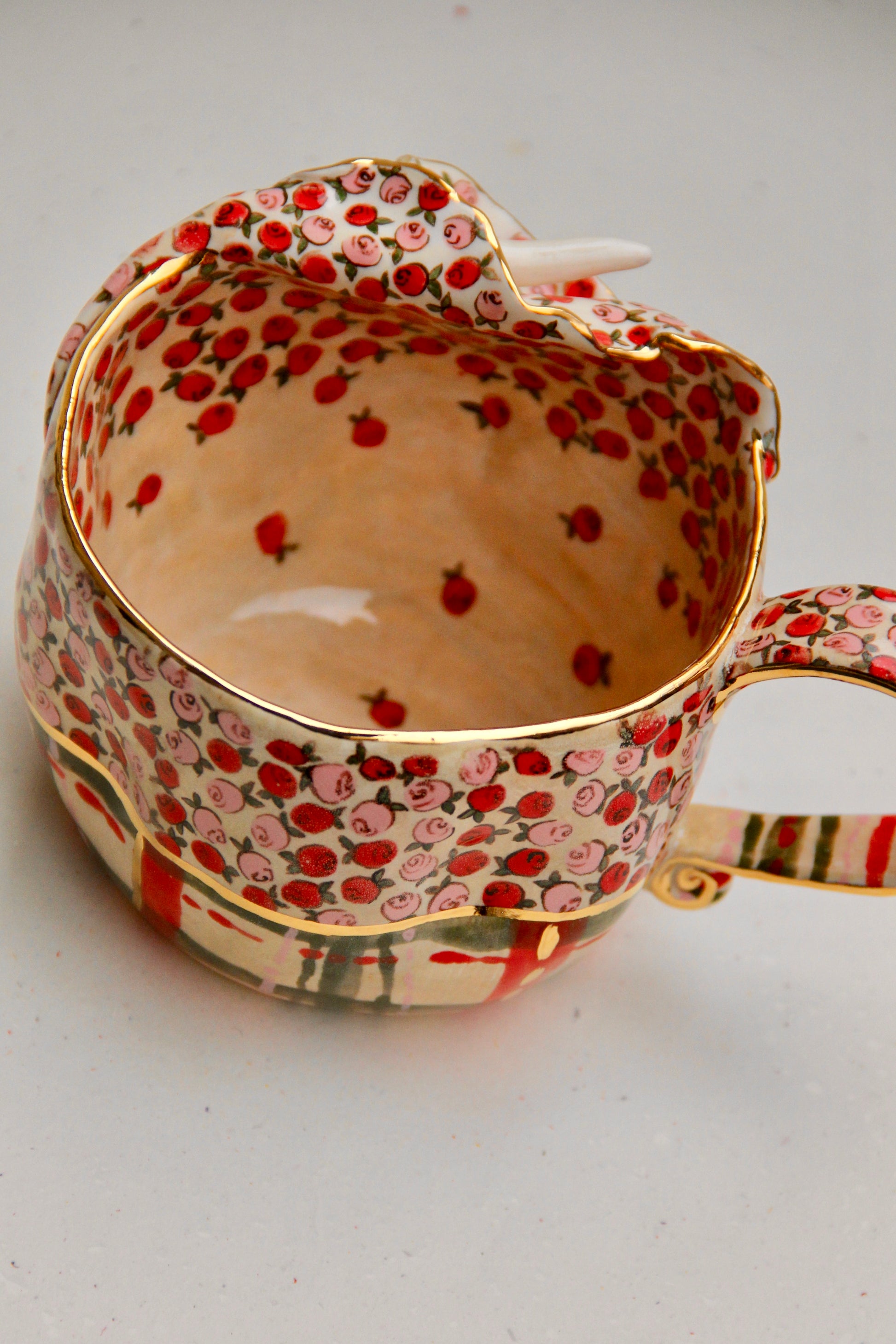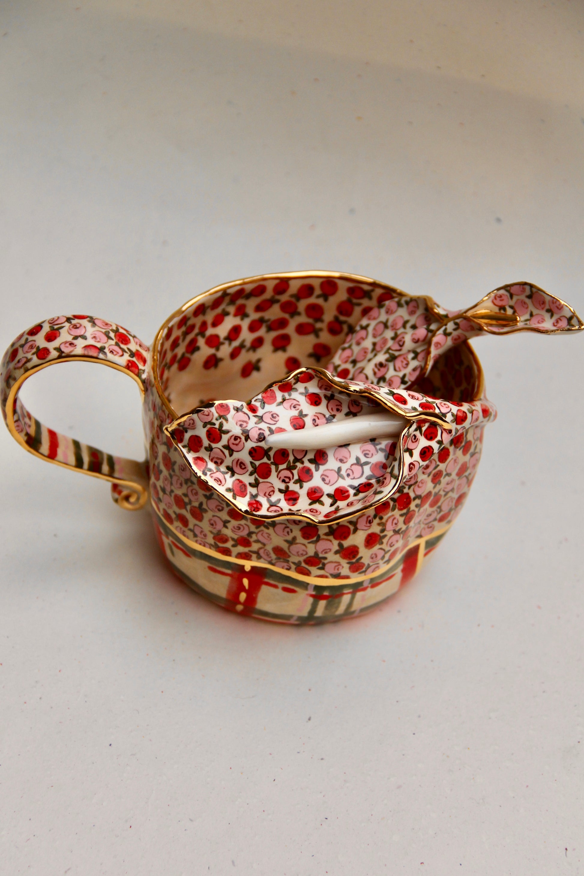 A romantic blend of vintage roses and elegant calla lily form, this mug is fully handmade and truly one of a kind. The upper surface is decorated with hand-painted rose motifs, while the striped festive base brings a cozy holiday charm.