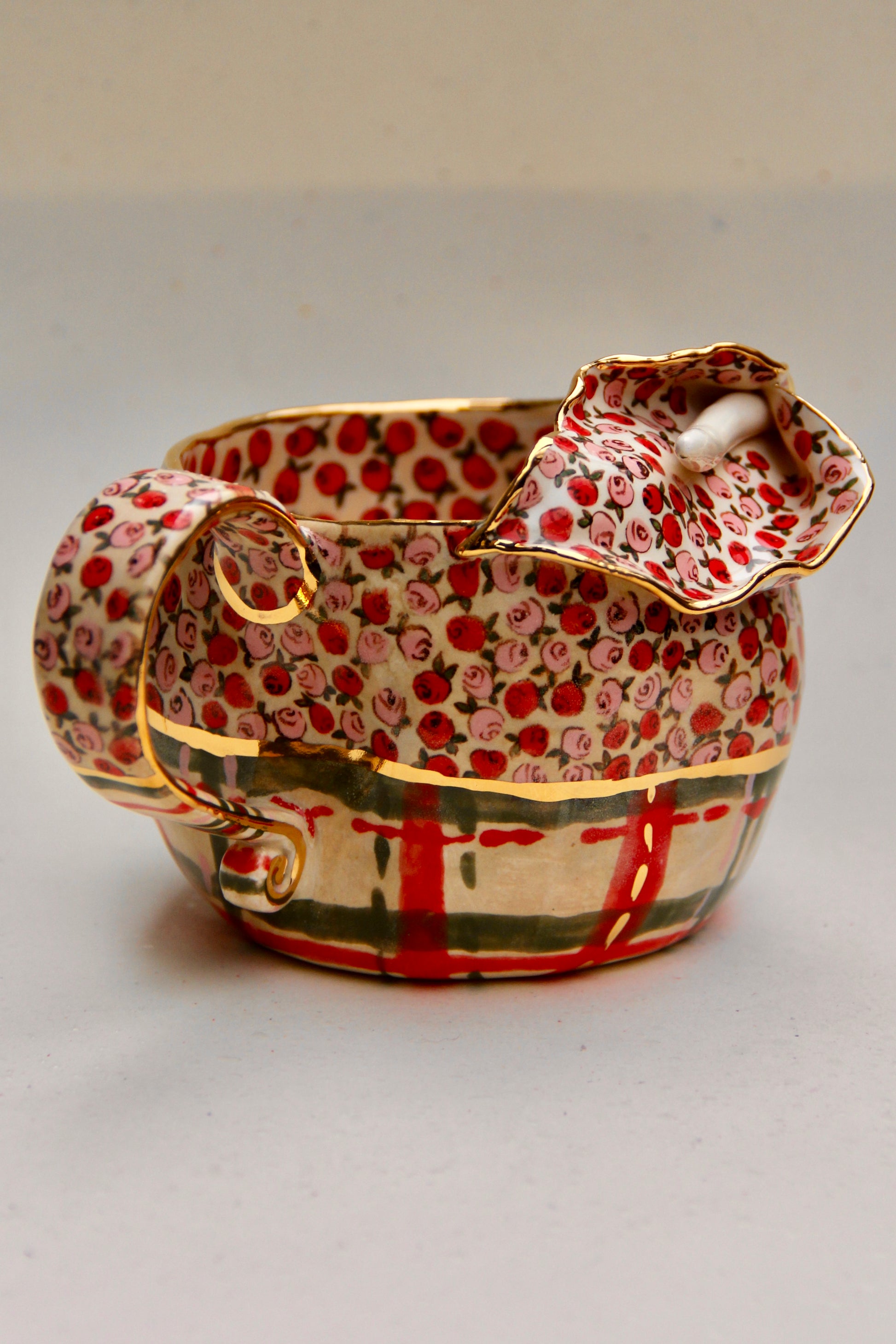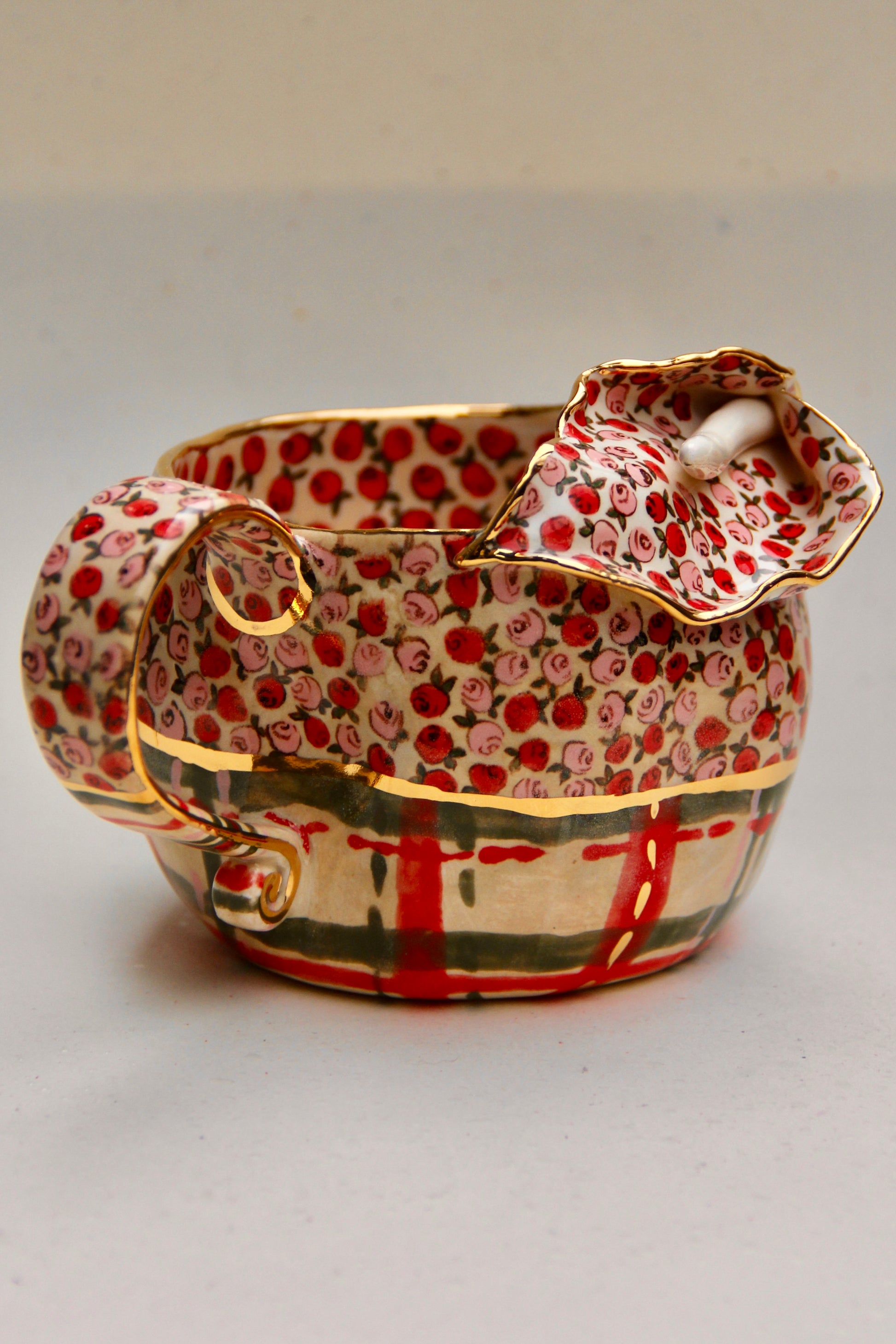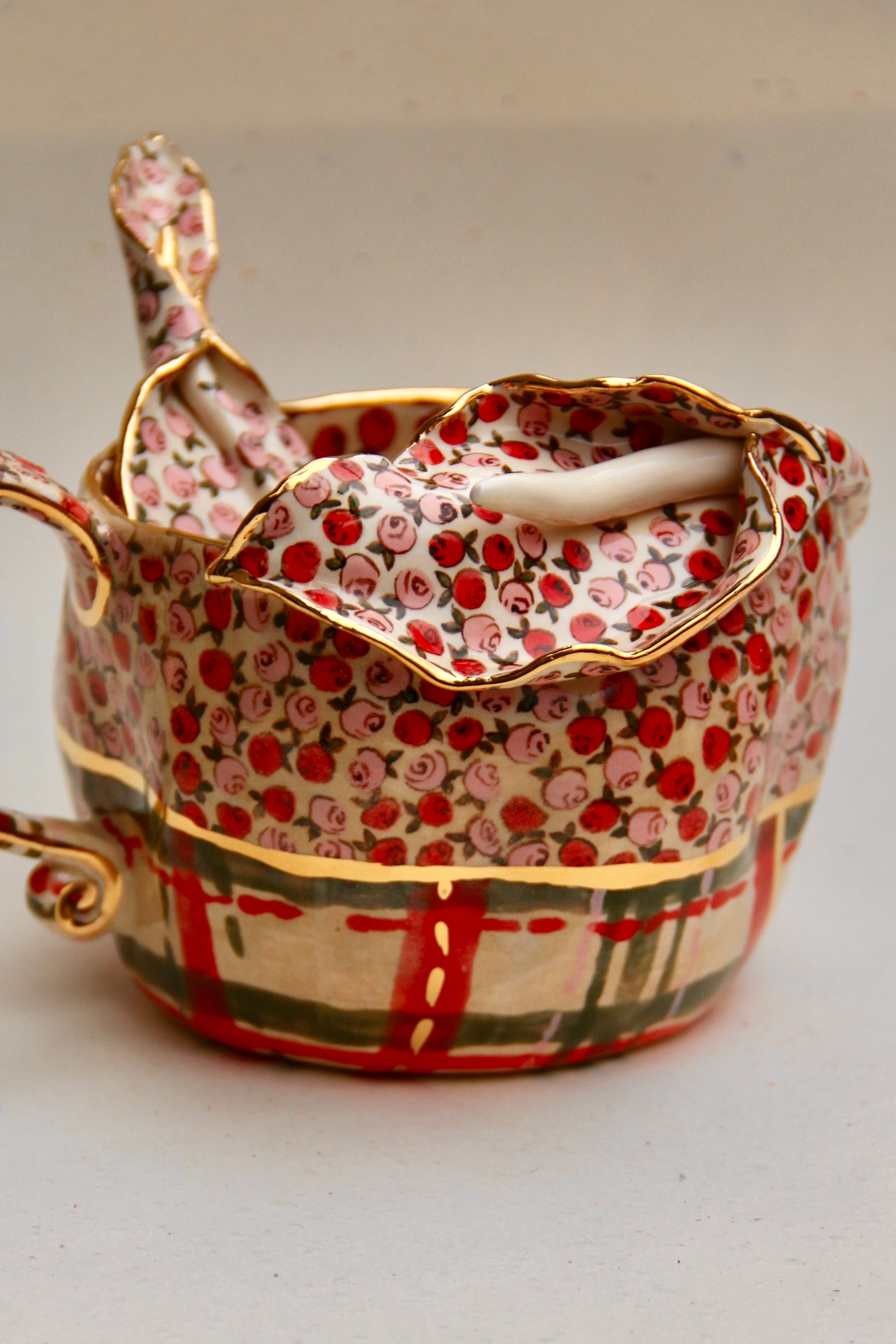 A romantic blend of vintage roses and elegant calla lily form, this mug is fully handmade and truly one of a kind. The upper surface is decorated with hand-painted rose motifs, while the striped festive base brings a cozy holiday charm.